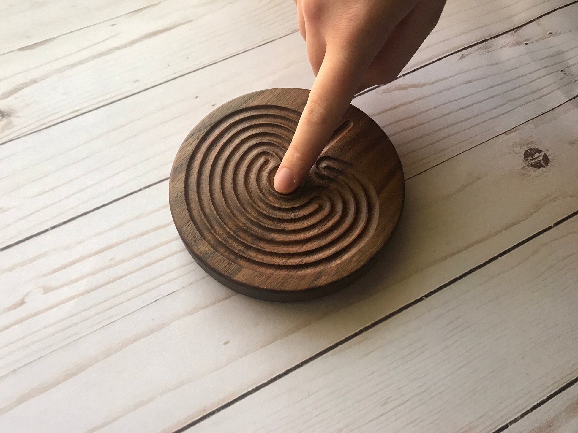 Finger labyrinths are traditionally used for mindfulness and meditation: by moving a finger slowly along the path, the "walker" can calm and center oneself. The principle is very simple, making it easy even for young children to use. Tracing a finger labyrinth is a right-brain activity enhancer and helps to calm down and enhances problem solving. It is not only useful but also beautiful.