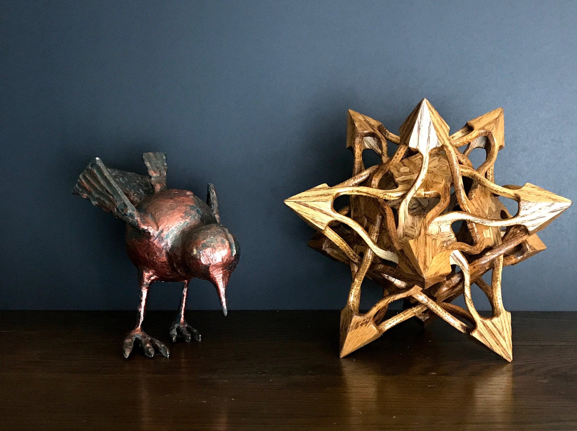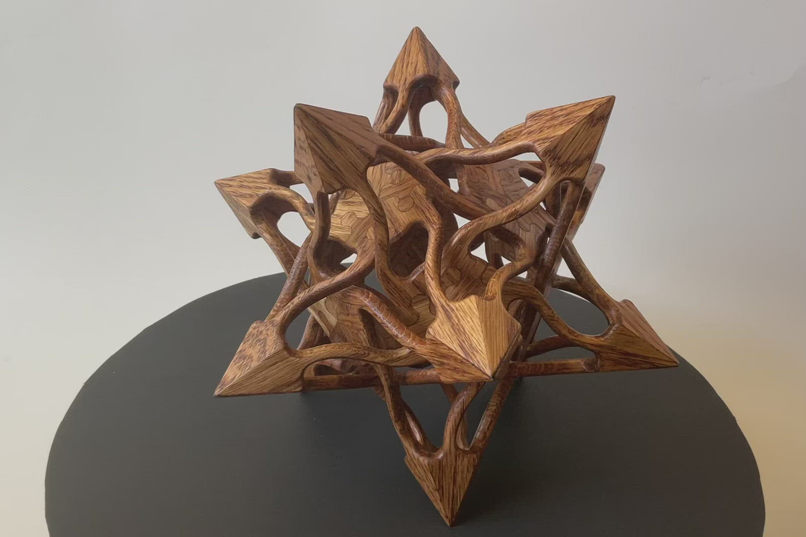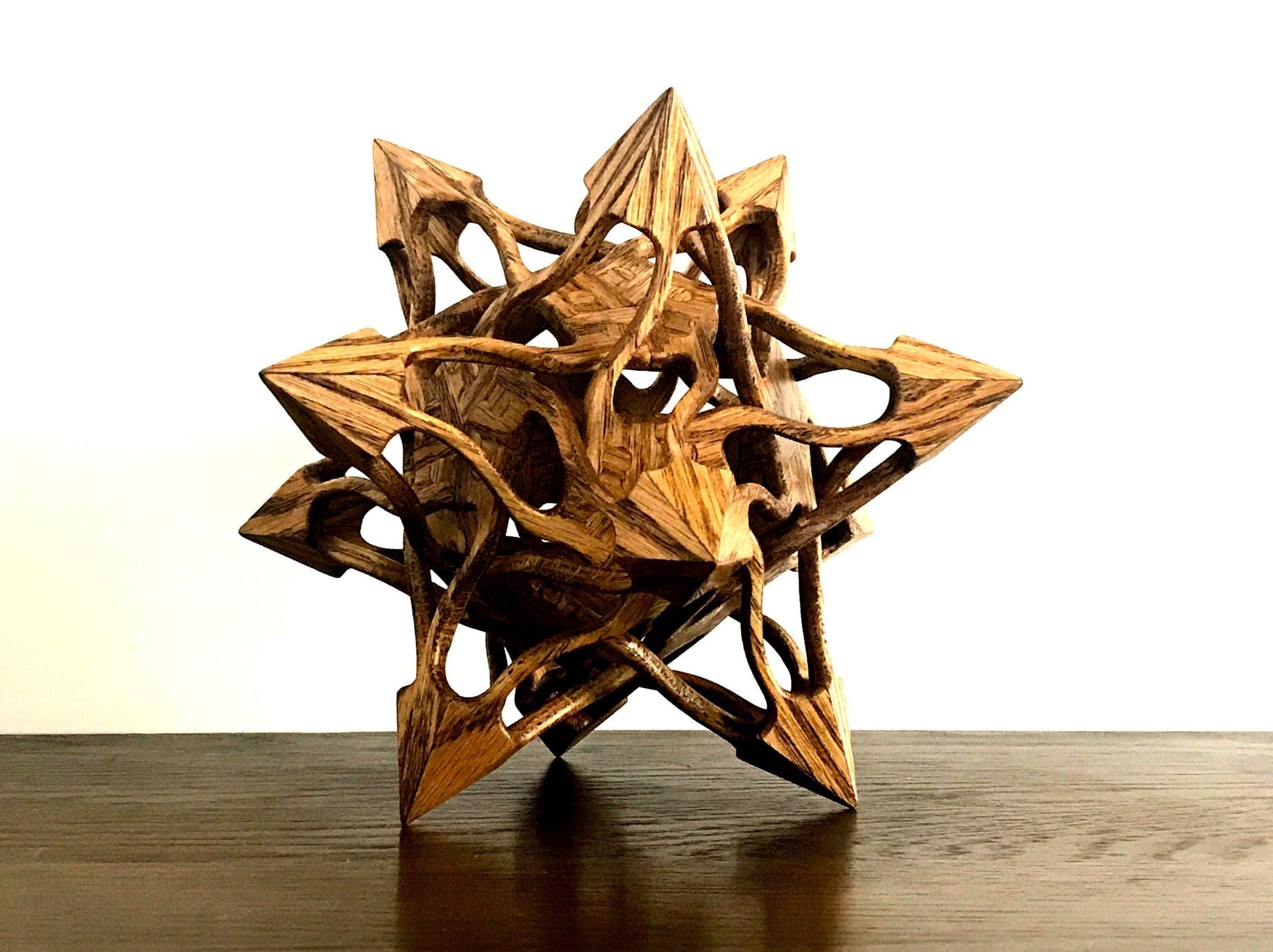 Stellated Dodecahedron Wooden Contemporary Sculpture, Oak Wood with Walnut Finish, 9"