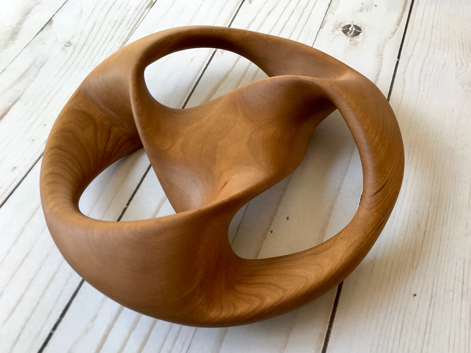 This abstract wooden sculpture is a Mobius strip-like representation of a trefoil - also know as triquetra or trinity knot.